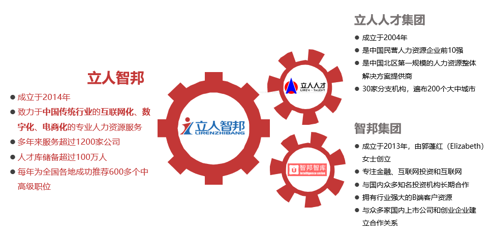 立人智邦成立于2014年,是由立人人才集團(tuán)與智邦人力集團(tuán)強(qiáng)強(qiáng)聯(lián)手共同組建,這兩家公司在業(yè)內(nèi)都具有十余年獵頭經(jīng)驗(yàn)的著名獵頭公司。立人人才集團(tuán)成立于2004年,是中國民營人力資源企業(yè)前10強(qiáng),也是中國北區(qū)第一規(guī)模的人力資源整體解決方案提供商。立人人才集團(tuán)擁有30家分支機(jī)構(gòu),遍布200個(gè)大中城市。立人人才集團(tuán)組織架構(gòu)為事業(yè)部制,外包事業(yè)部、獵頭事業(yè)部(立人智邦)、管理咨詢事業(yè)部、互聯(lián)網(wǎng)+事業(yè)部。智邦集團(tuán)成立于2013年,由郭蓬紅(Elizabeth)女士創(chuàng)立,在創(chuàng)業(yè)初期以專注互聯(lián)網(wǎng)投資和互聯(lián)網(wǎng)被投企業(yè)提供人才服務(wù)為主線,同時(shí) 探索二三級(jí)城市傳統(tǒng)行業(yè)為輔線。智邦集團(tuán)與國內(nèi)眾多知名投資機(jī)構(gòu)長期合作,擁有行業(yè)強(qiáng)大的B端客戶資源。目前已與眾多家國內(nèi)上市公司和創(chuàng)業(yè) 企業(yè)建立合作關(guān)系,并成就了優(yōu)秀人才的職業(yè)發(fā)展。